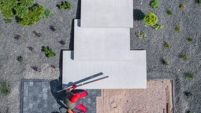 A construction worker carefully places concrete steps in a garden area, surrounded by gravel and plants, under clear skies during the day.